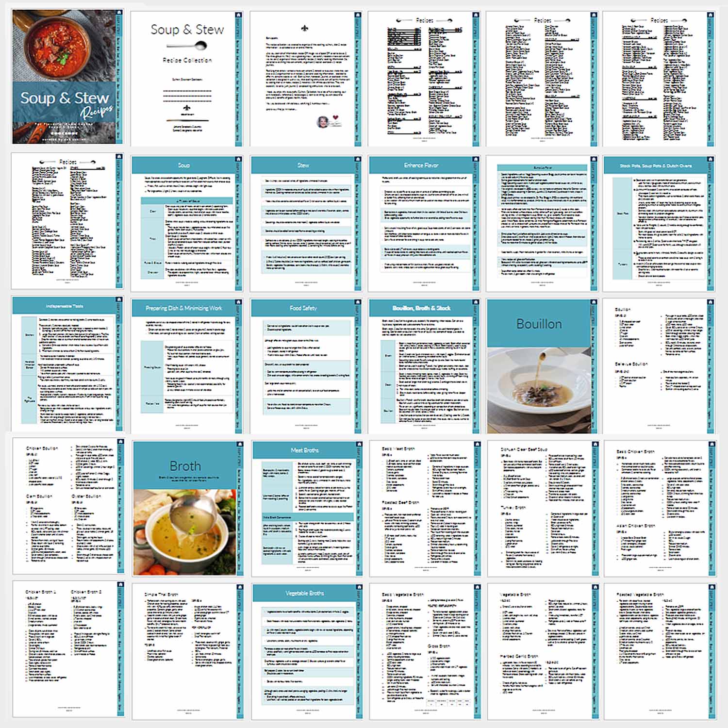 • 5 bouillon, 22 broth, 33 stock, 10 cheese soup, 70 bisque, 30 cold soup, 24 bean soup, 10 Moroccan soup, 25 onion soup, 23 minestrone, 130 vegetable soup, 55 additional soup recipes